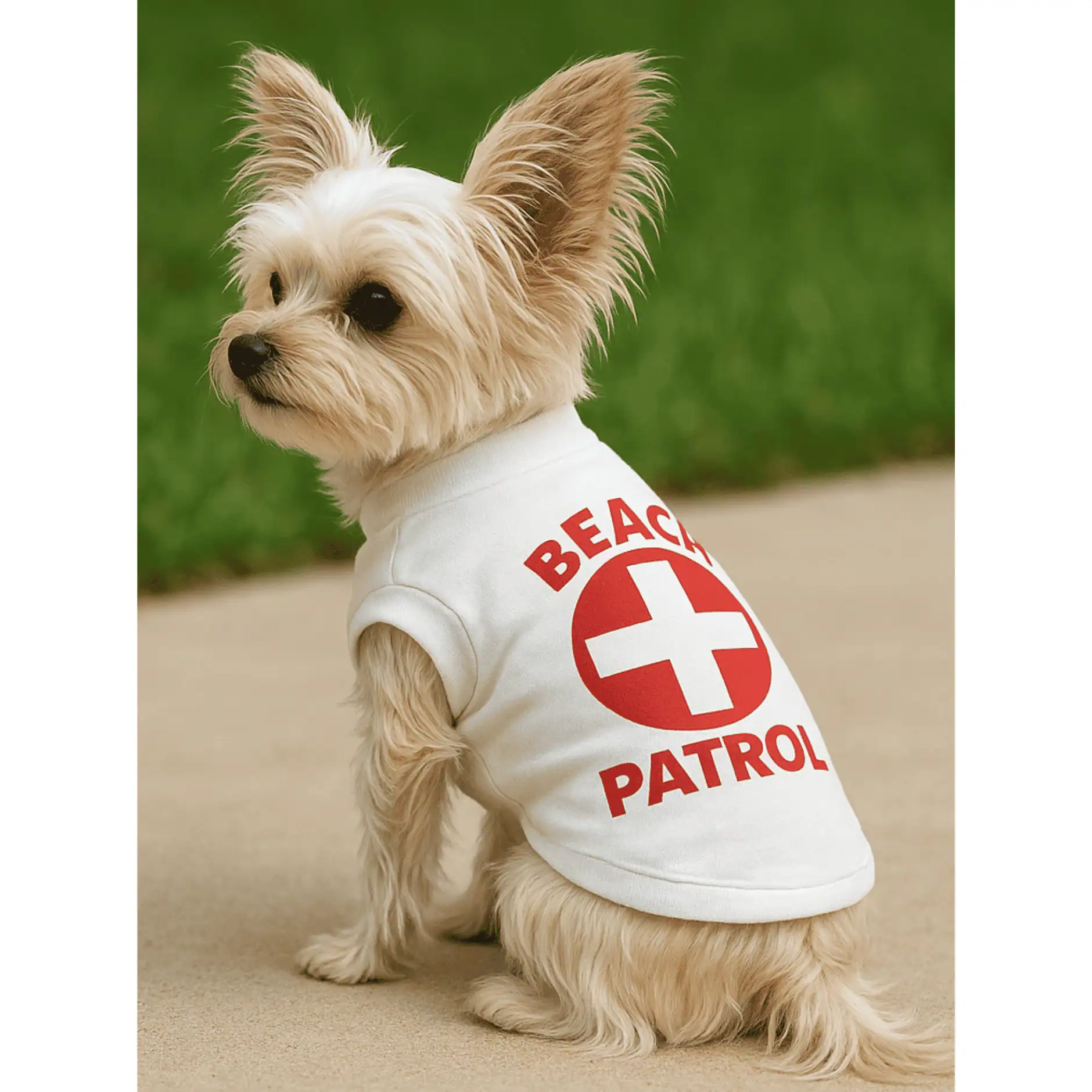 Keep your pup on lifeguard duty in style! The Beach Patrol Dog Tank is the perfect summer essential for seaside adventures and sunny strolls. Made from 100% soft, breathable cotton, this crisp white dog shirt features a fun lifeguard-style “Beach Patrol” graphic that’s sure to make waves.