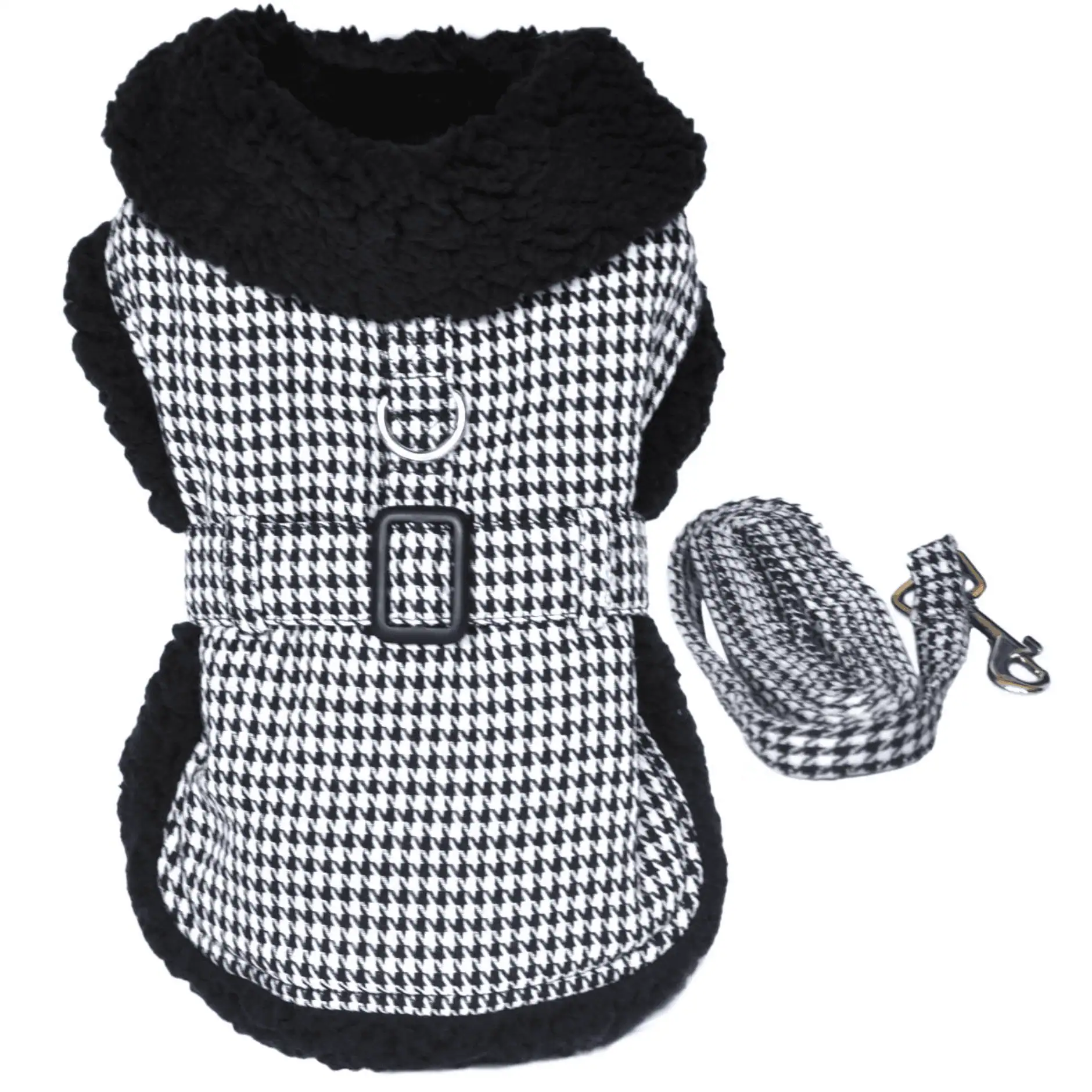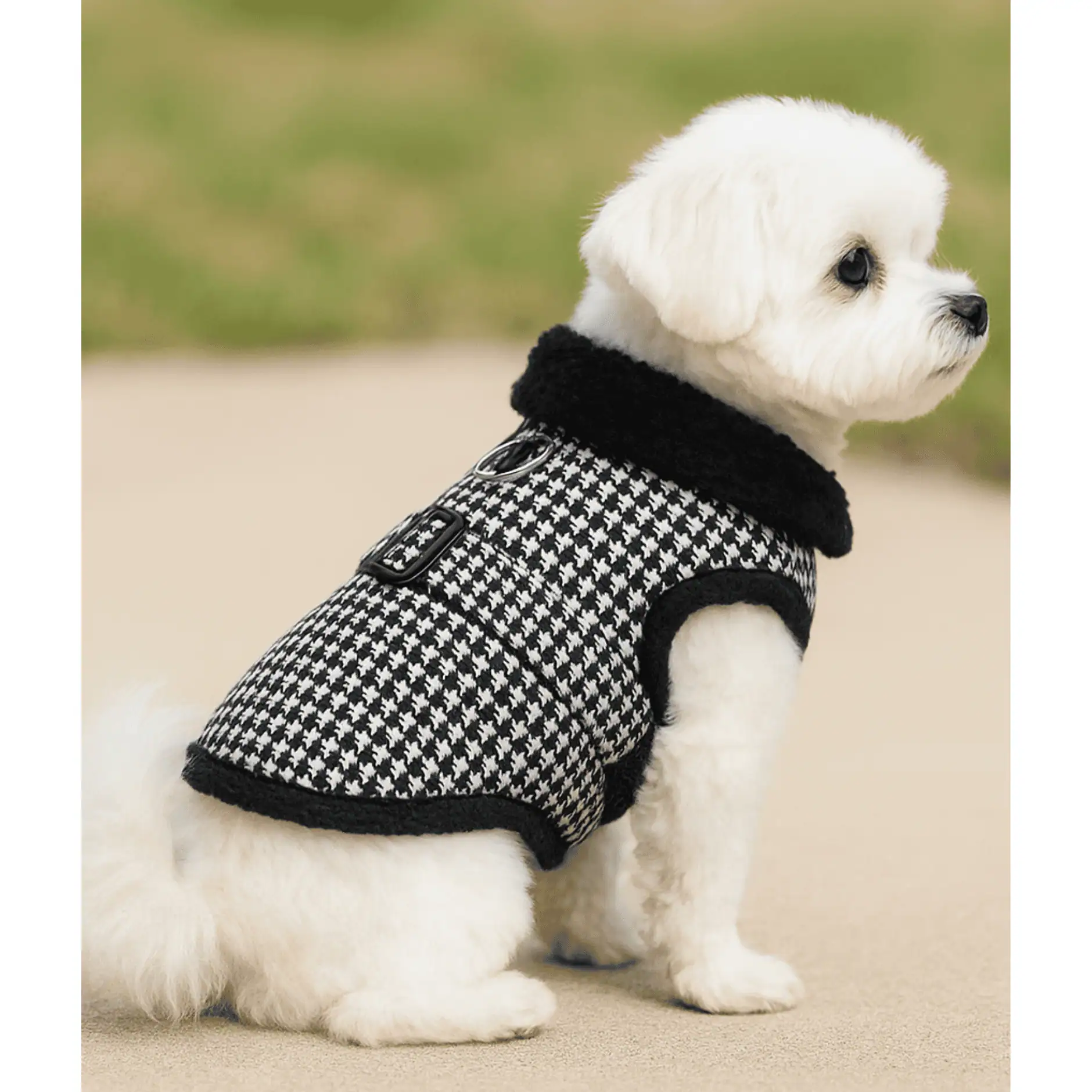 Timeless style meets cozy comfort with our Black and White Classic Houndstooth Dog Coat—a beloved favorite brought back by popular demand. This elegant coat features a thick, soft fleece fur collar and warm lining to keep your pup comfortable during chilly walks.