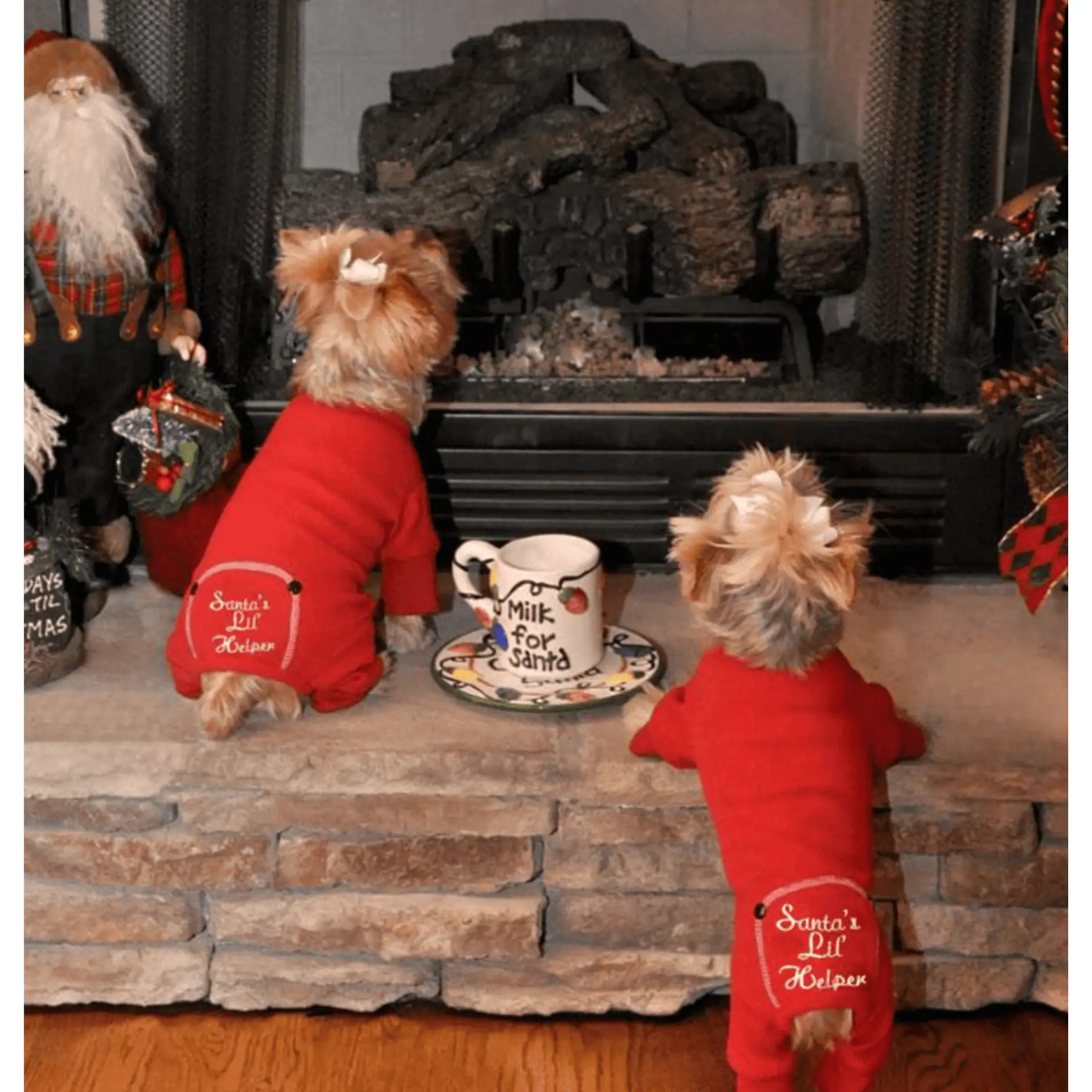 Adorably embroidered with “Santa’s Lil’ Helper” on the back, these pajamas are perfect for holiday photos, cozy nights by the fire, or helping wrap presents. The open tail end design allows for quick potty breaks, making them as practical as they are cute.