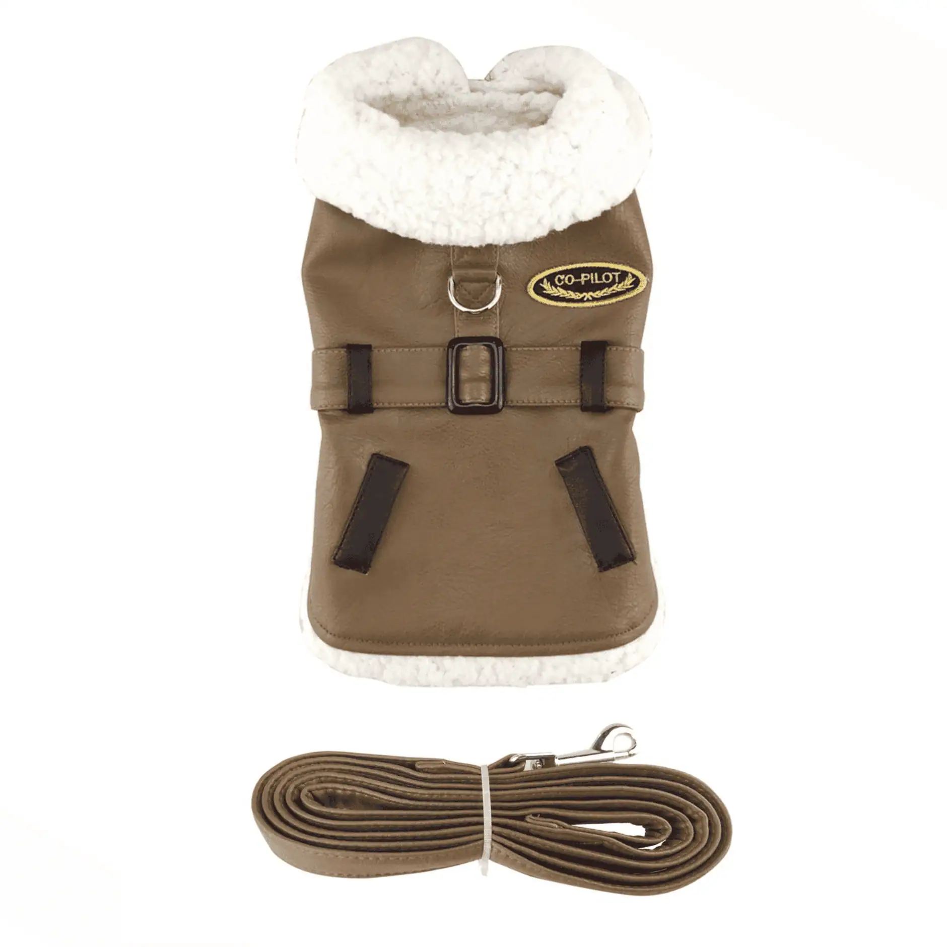 Give your pup a timeless, rugged look with our Designer Brown Vintage Bomber Coat & Leash. Crafted with a dark brown faux leather outer body, this high-quality coat features black faux leather pockets and belt loops for an authentic aviation-inspired design. The embroidered “Co-Pilot” wings emblem adds the perfect finishing touch of classic charm.