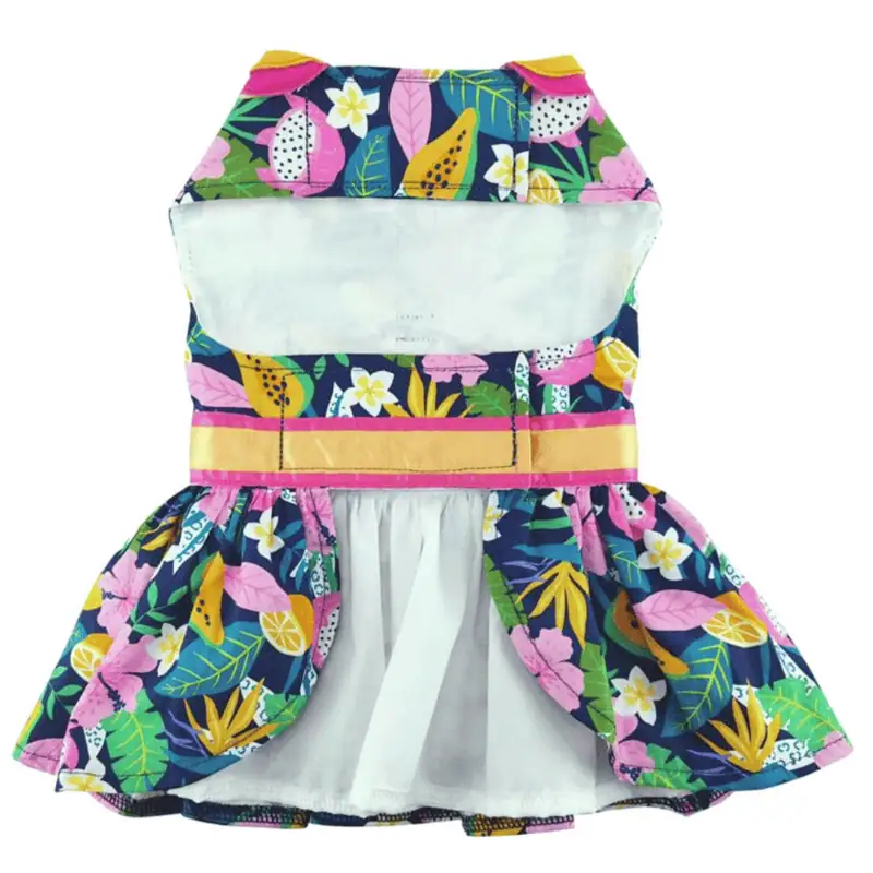 Set against a bold navy backdrop, this cheerful dress bursts with colorful flowers and juicy fruits — perfect for sunny strolls, backyard barbecues, or vacation photo ops. The eye-catching yellow and pink double collar, paired with a sweet yellow bow, brings a playful pop of color to your pup’s look.