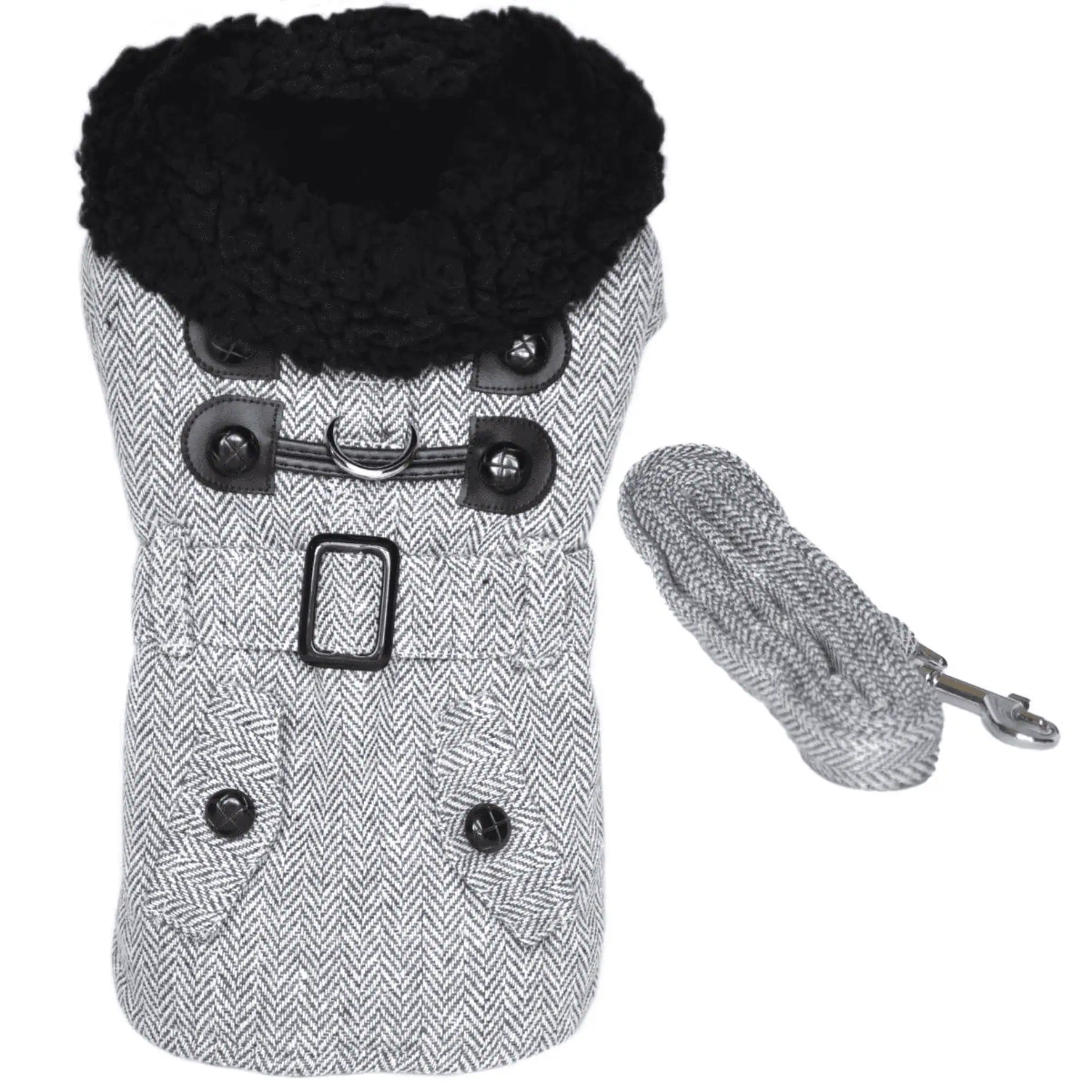 Stylish and cozy Grey Herringbone Dog Coat with Matching Leash for your pup! Elevate fashion and comfort on every walk. Perfect for colder seasons. Shop now!