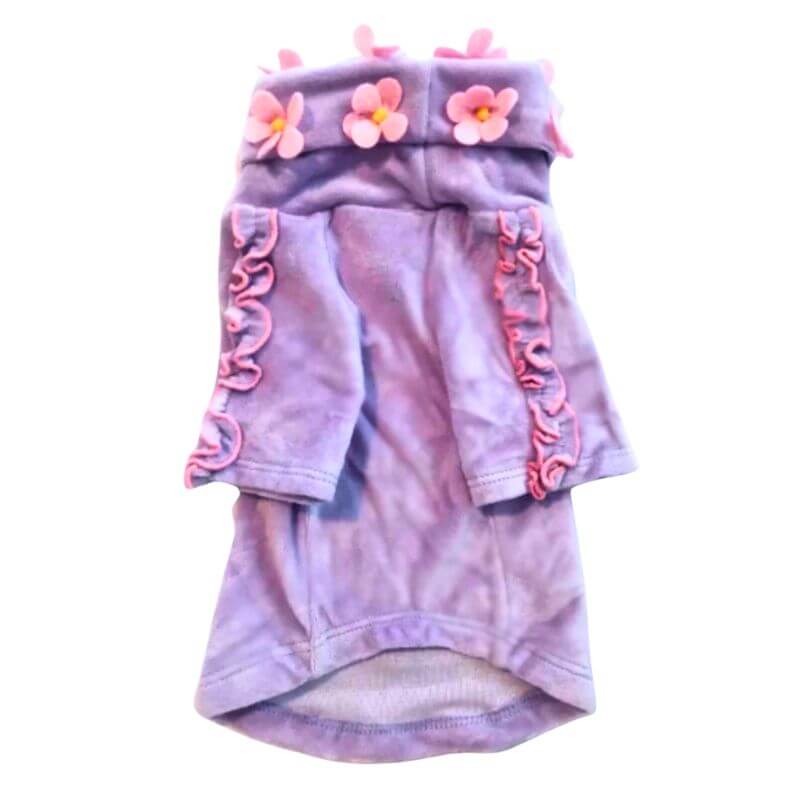 Wrap your pup in warmth and sophistication with the Hillary Dog Turtleneck from the Little Lily Collection. This beautifully designed dog sweater is crafted from plush purple velour, delivering both comfort and fashion-forward style for cooler seasons. Adorned with soft frill arm detailing and delicate pink flower appliqués, this turtleneck strikes the perfect balance between elegance and coziness.