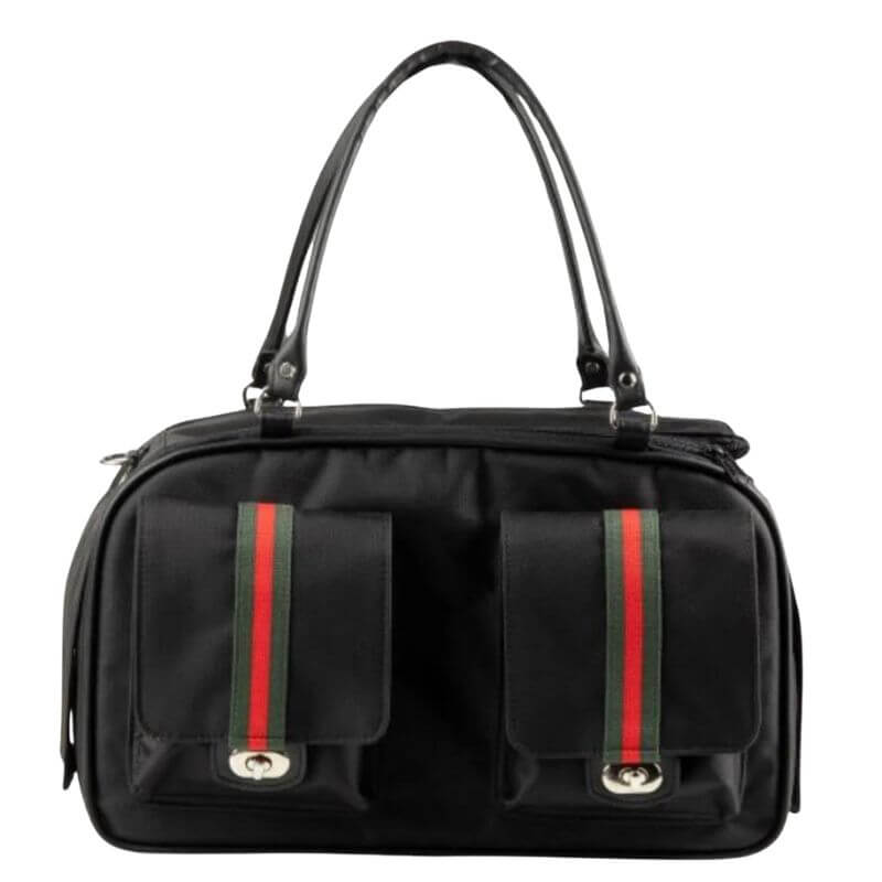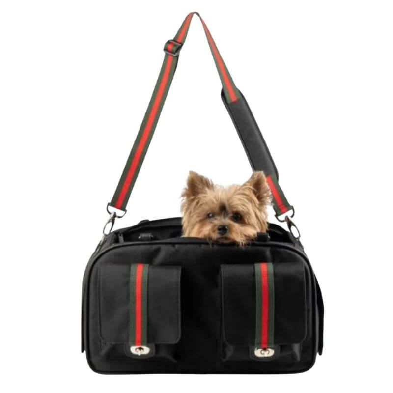 The Marlee – Black with Stripe Carrier is the ultimate designer dog bag for those who love style and convenience. Whether you’re sneaking your dog into stores or traveling by plane, this luxurious yet practical carrier ensures your pet can accompany you everywhere.