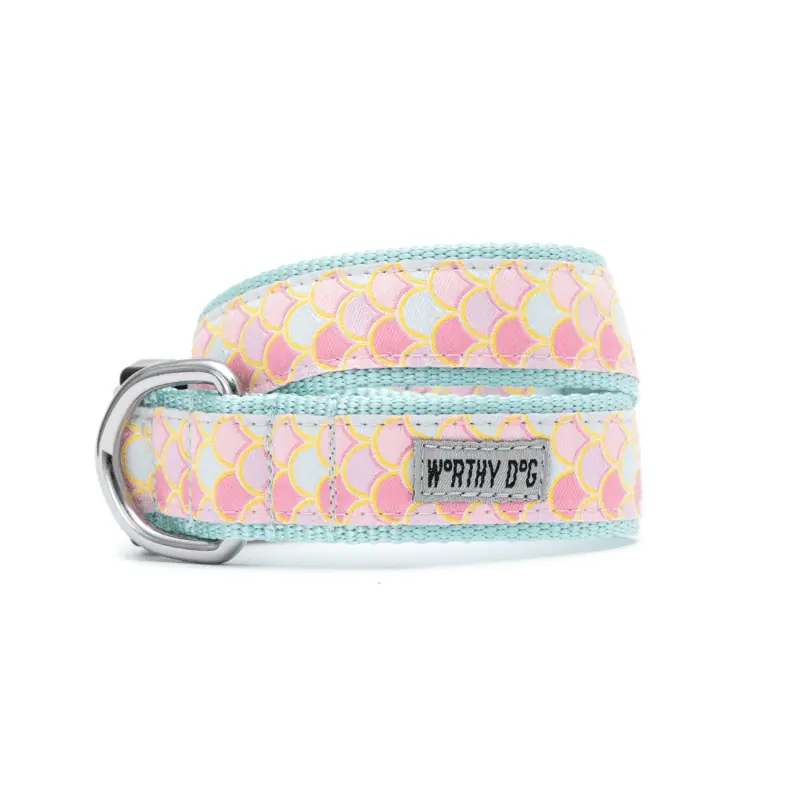 Give your pup a splash of style with the Mermaid Adjustable Dog Collar and Matching Leash, designed for both durability and charm. Featuring a beautiful mermaid-themed woven ribbon, securely stitched onto strong yet comfortable nylon webbing, this collar is built for everyday wear. The quick-release buckle ensures easy on-and-off convenience, while the nickel-plated D-ring offers a sturdy attachment for tags and leashes.