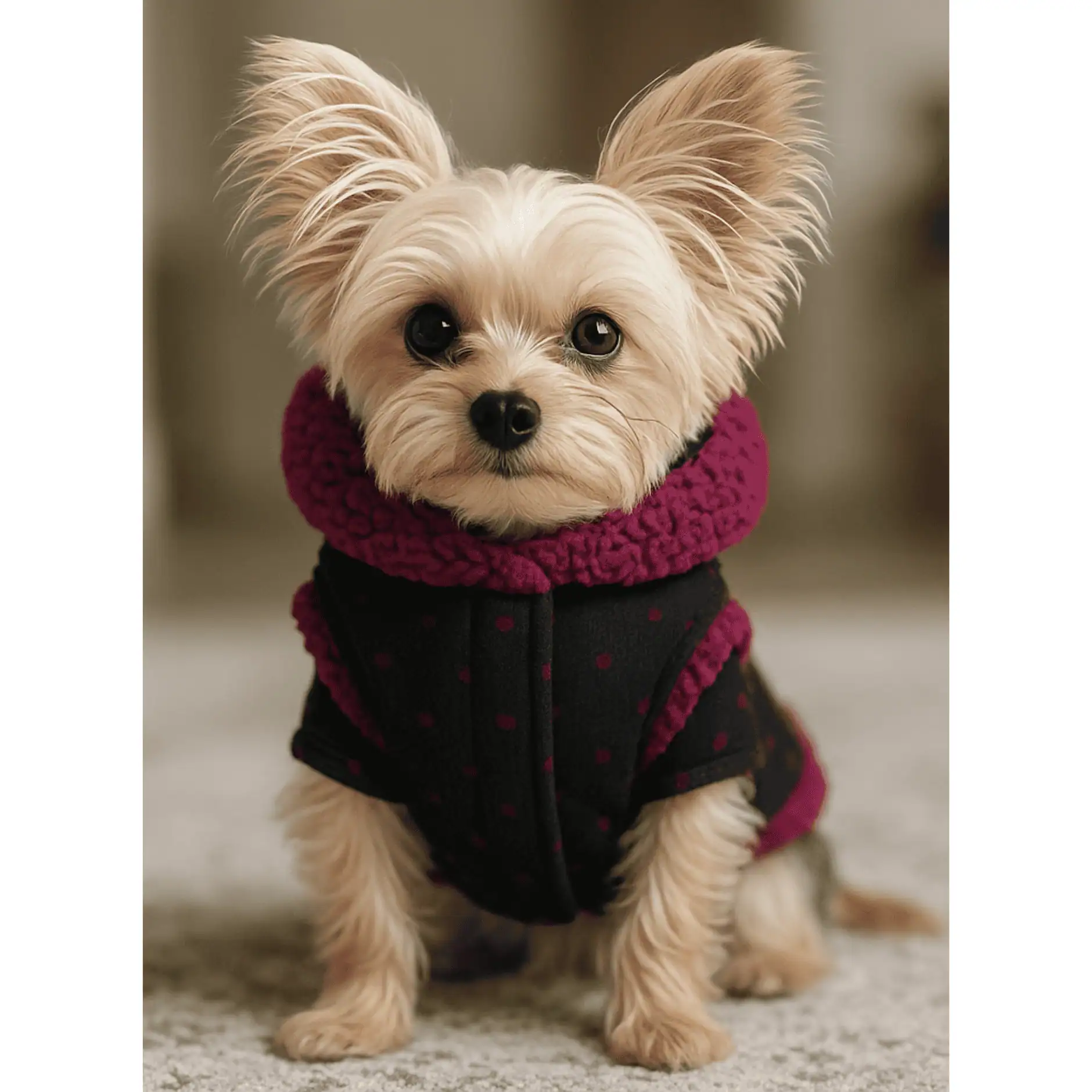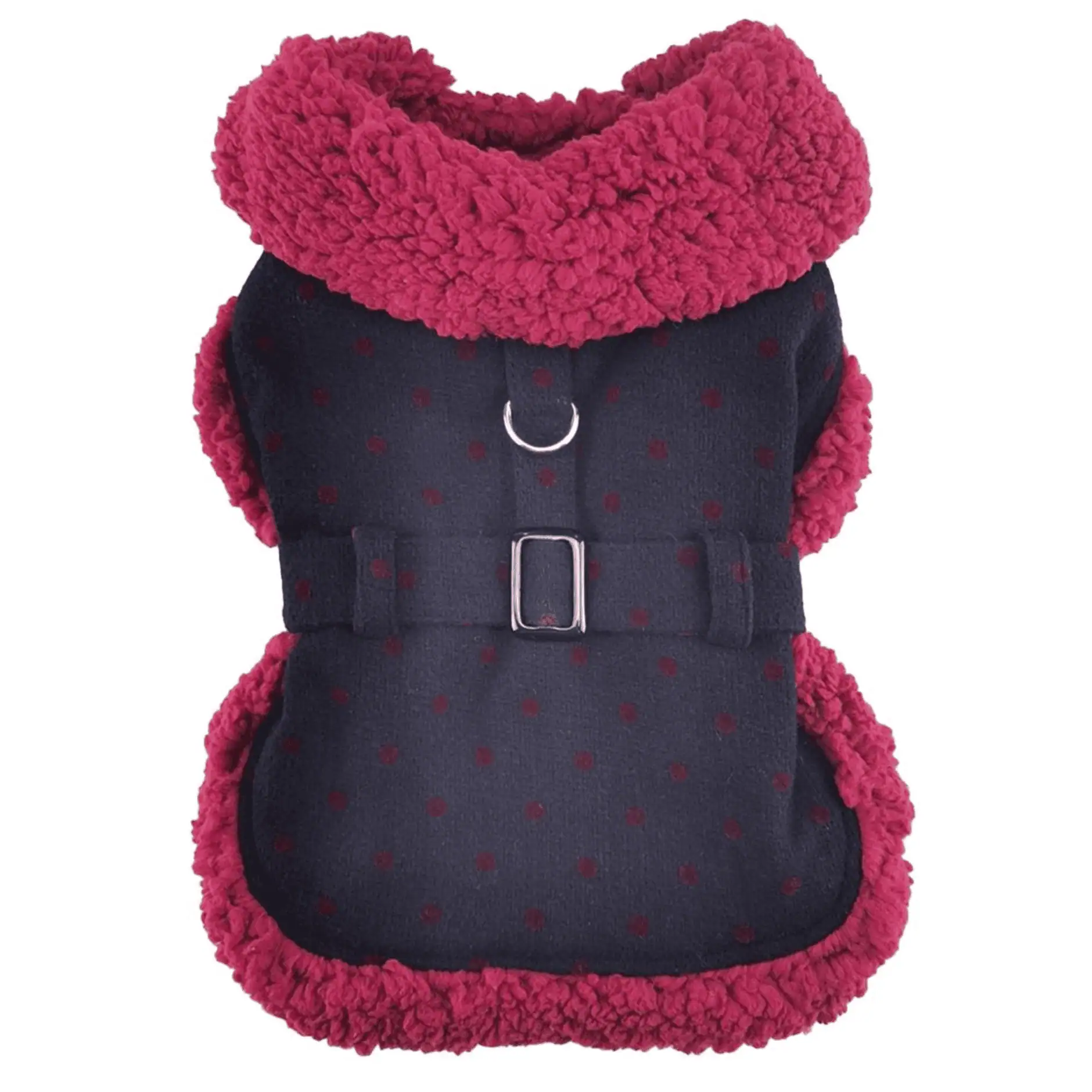 Wrap your pup in warmth and elegance with our Sherpa-Lined Dog Harness Coat in Black and Burgundy Dots. Designed for both comfort and sophistication, this stylish coat features a high-quality cotton/polyblend outer with a soft fleece fur collar and sherpa lining to keep your dog cozy on chilly days.