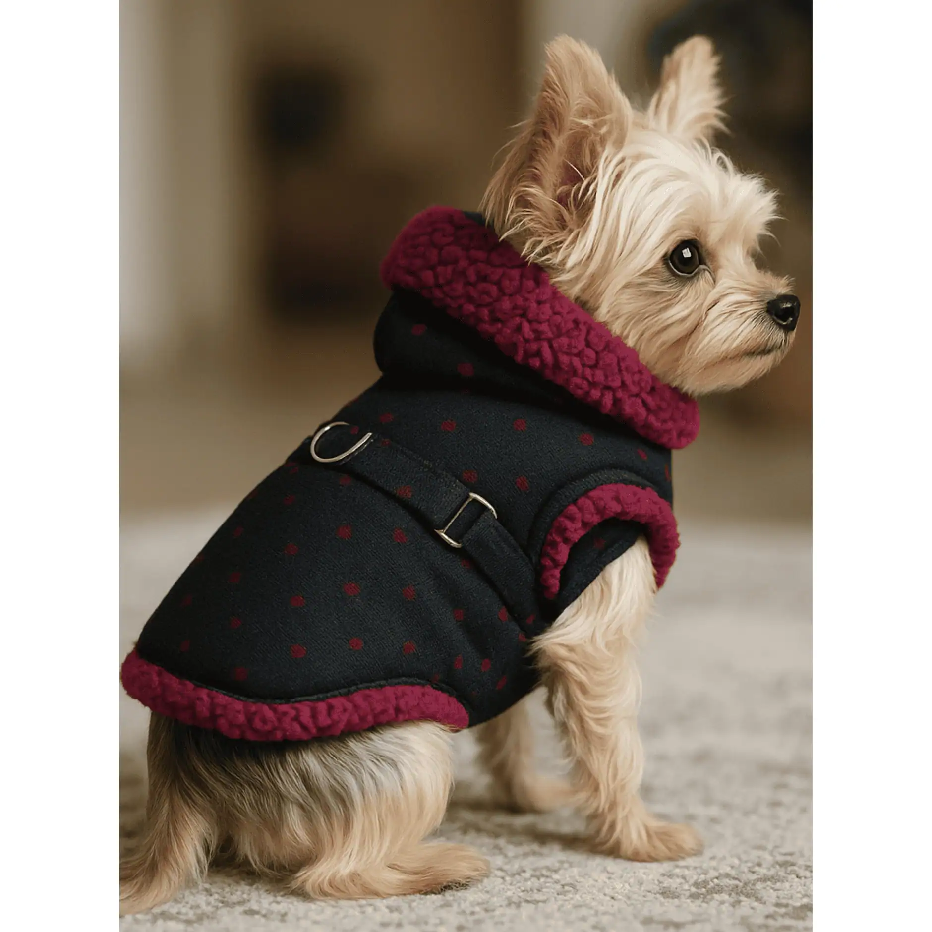 Sherpa-Lined Dog Harness Coat – Black & Burgundy Dots