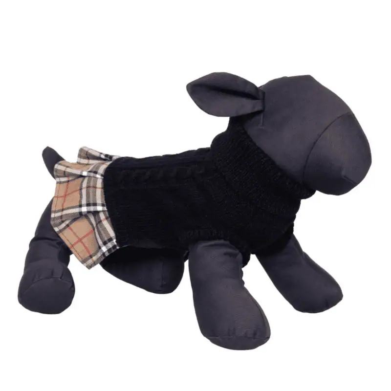 Your pup will be turning heads all season long in the Tan Plaid Turtleneck Dog Sweater Dress! This cozy-meets-classic piece features a warm double-knit acrylic sweater top with a chic turtleneck collar and an attached woven plaid skirt for the perfect winter ensemble.